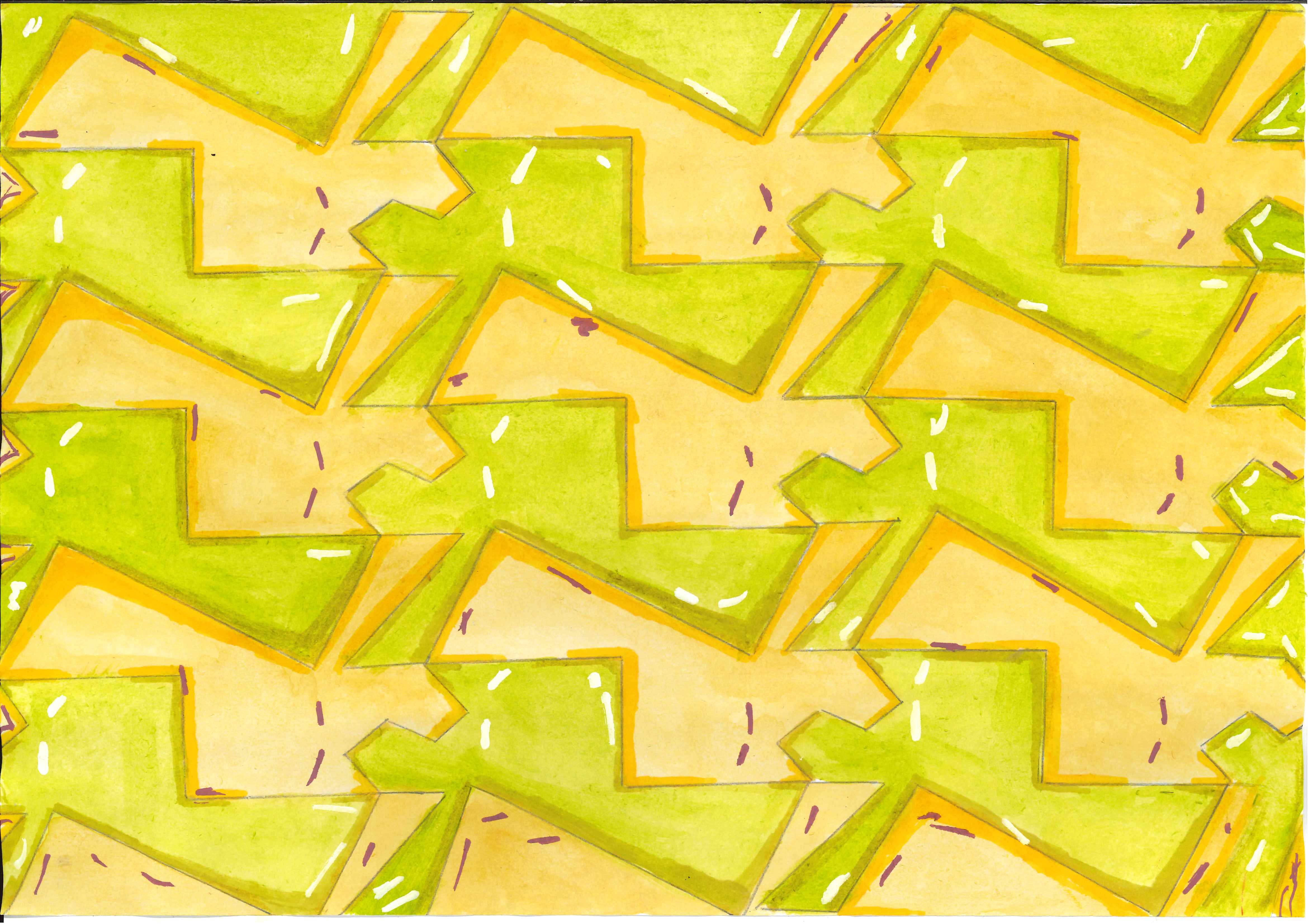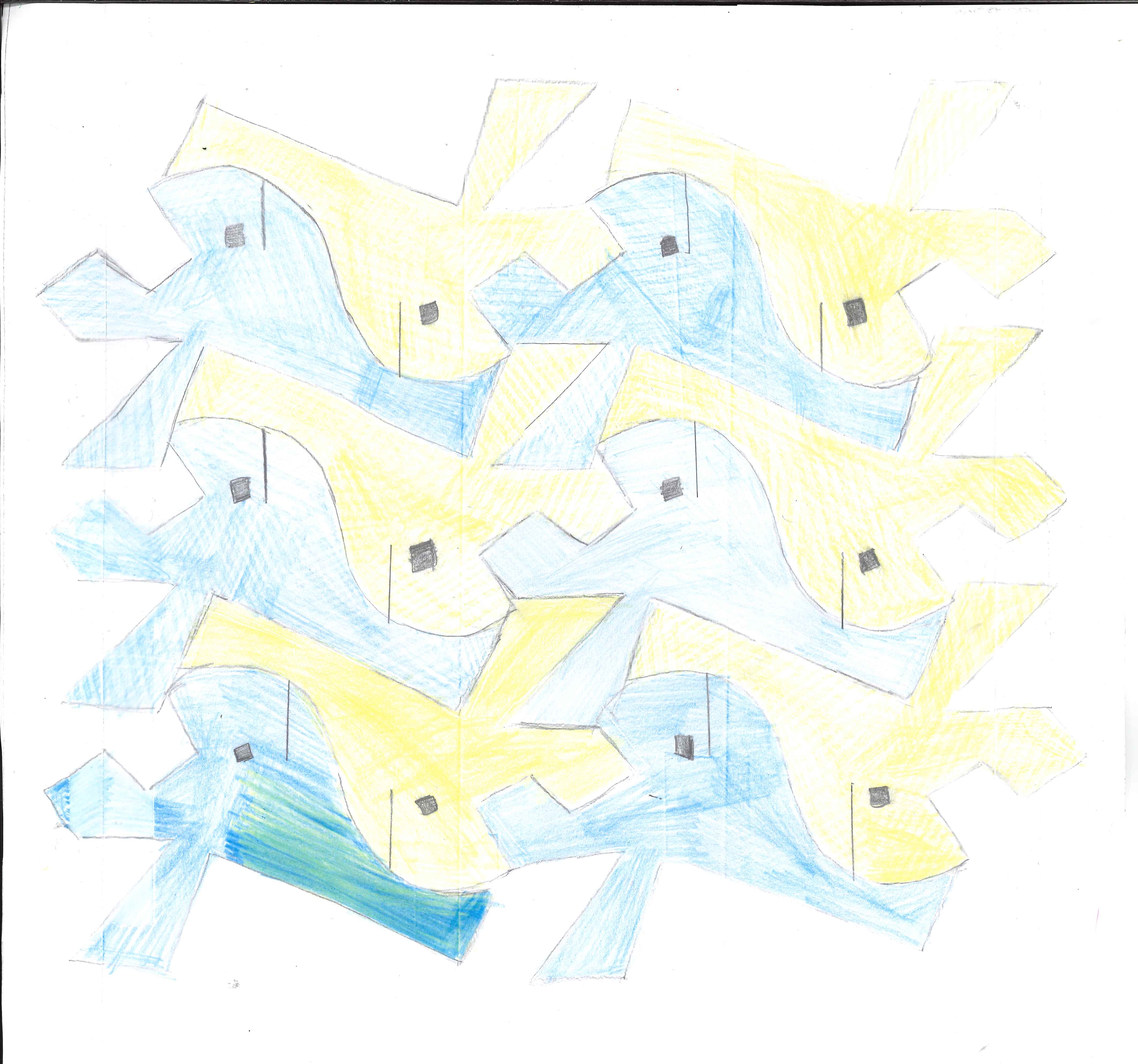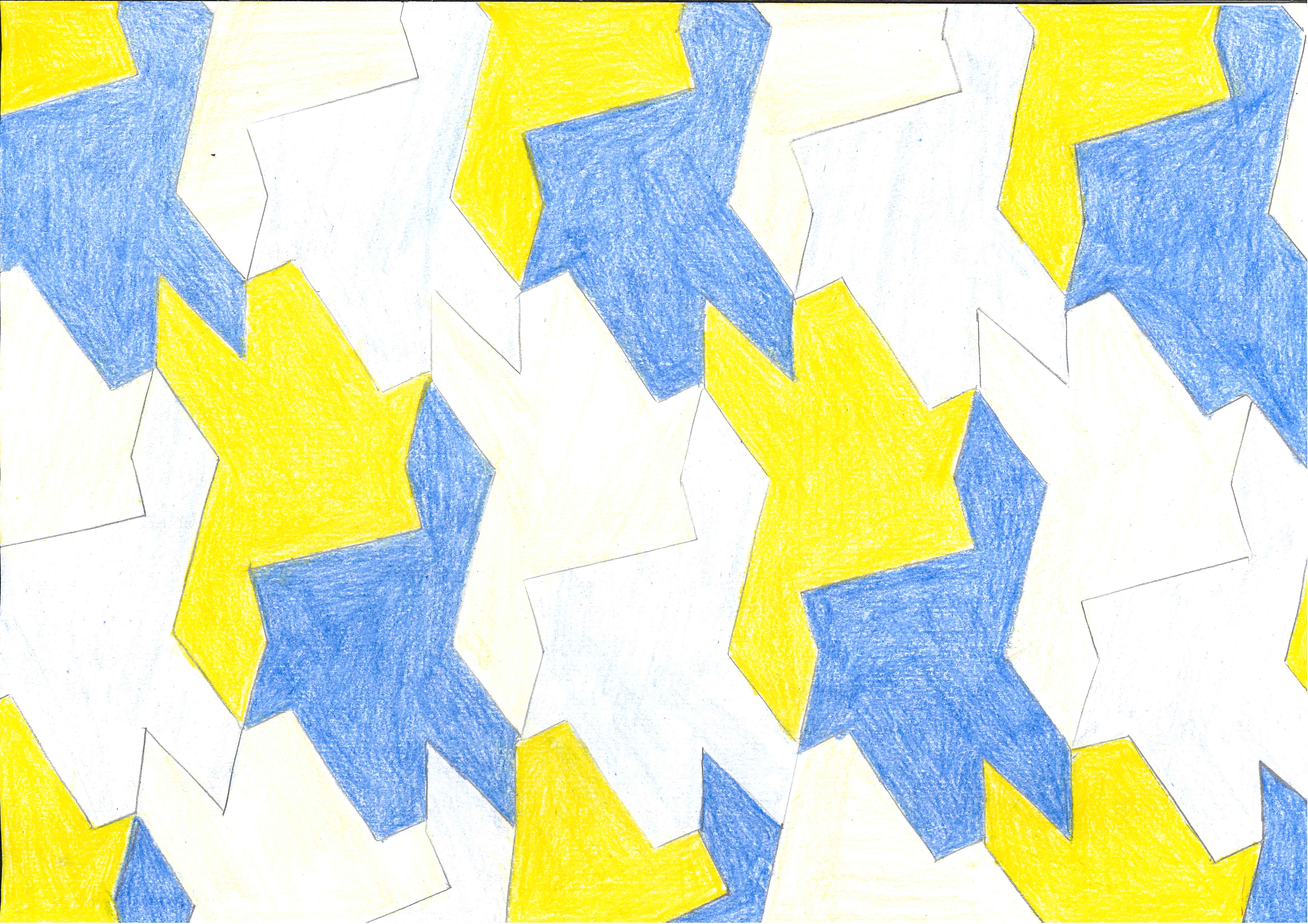 Lors de la dernière séance de mathématiques avant les vacances de la Toussaint, les élèves de 5e du groupe Eratosthène ont utilisé leurs connaissances en symétrie centrale pour paver le plan. Ils se sont inspirés des œuvres pavées de Maurits Cornelis Escher (1898-1972) pour construire leur propre pavage, selon les étapes suivantes :